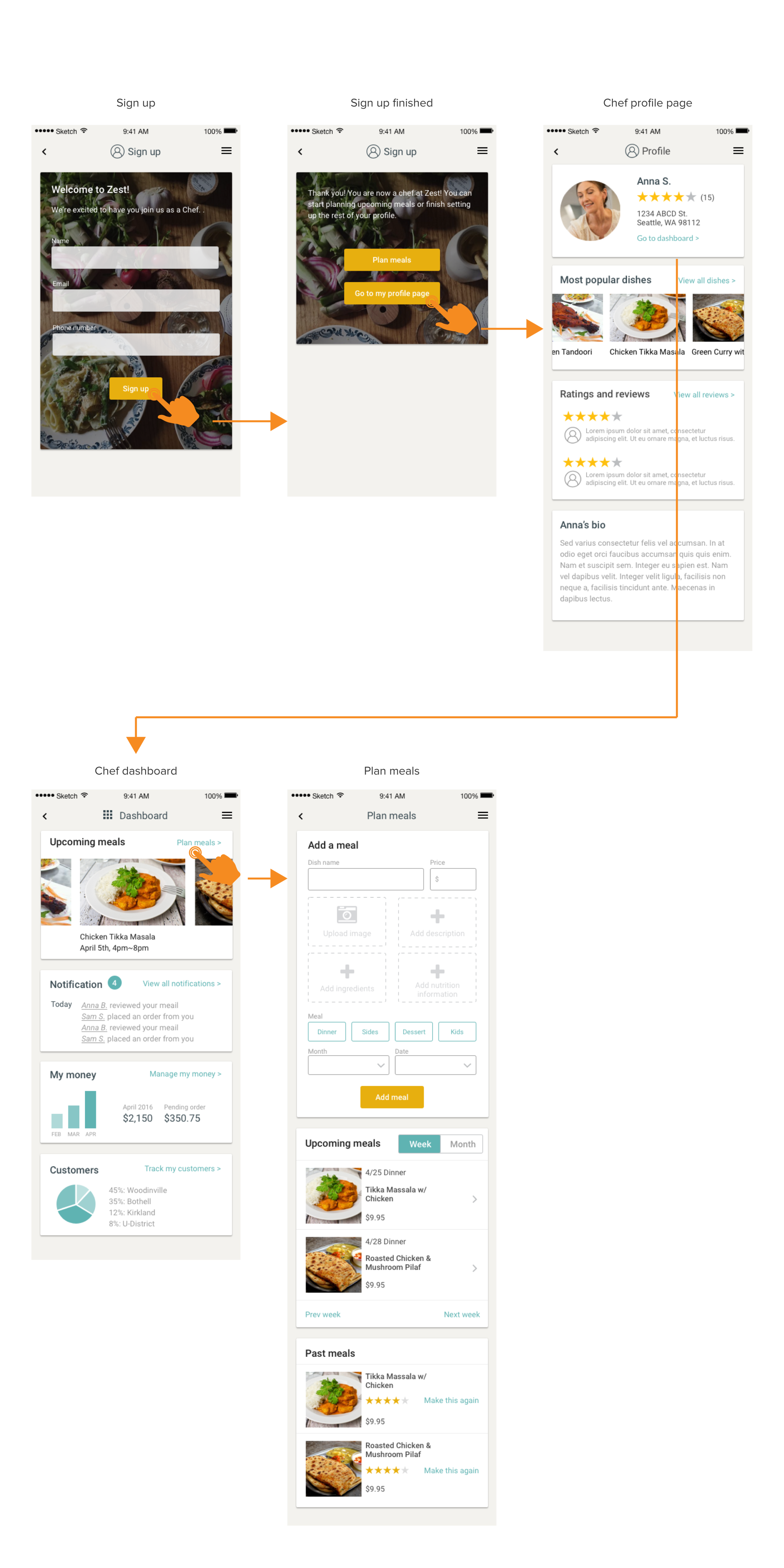 The Project: Zest was a quick study for a cottage food app that my partner at Sit/Set design and I worked on together. The client wanted to get an idea of what an app like this could look like. We approached the quick problem-solving exercise by looking at food app precedents and providing flows for not only the customers but the chefs themselves.